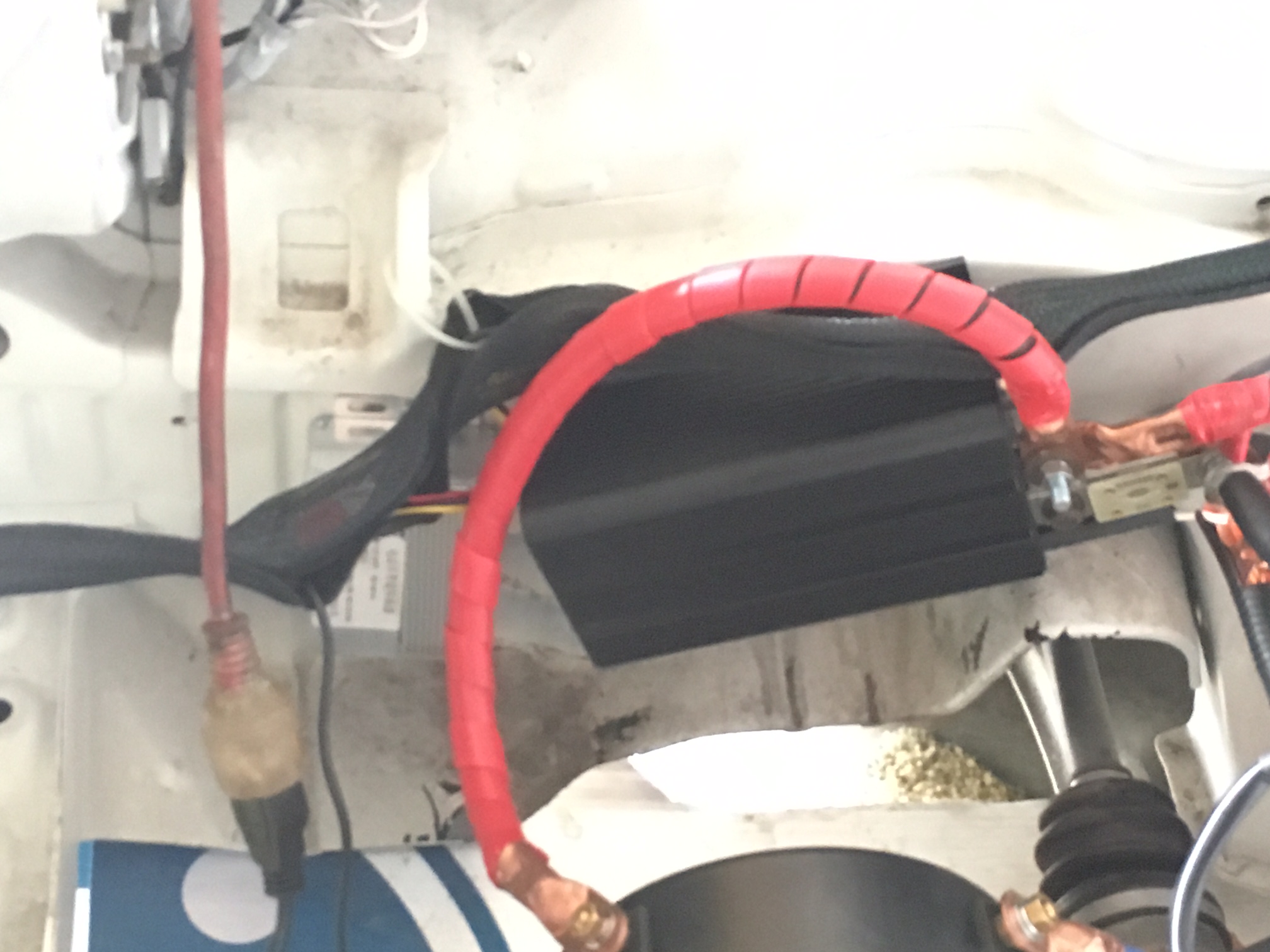 Got a bunch of stuff done March 5, 2016. Finished the battery bracket, tied it to the floor of the car, got some brush on electrical tape to mark each terminal on the edge of the bracket, ran the 2/0 cable from the front of the car to the battery pack, and tested out the 48v to 12v dc dc converter and tested it with a radiator fan. I also moved the charger to the front of the car.