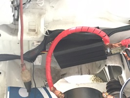 The cables to tie the batteries together was some 4/0 I got on sale on Princess Auto March 2, 2016. There was a scrap piece so I made an offer and they took it. I used most of the copper on the 4/0 and stuffed it into the standard post terminals. I lock-tited the threads on the clamp and then painted the black with some brush-on electrical tape. I plan to get some red and then do all the connections on the front of the car once I have the fittings I want to use in place and torqued up.