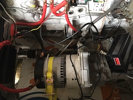 Got a bunch more done March 15, 2016 and got the dc dc converter mounted in front of the controller, wired up, and some of the looming to make it look nice. Also put the 12 volt mains back together and got the main fuse box cover back on. I also have some work to do with a dremel to make the 12 volt mains switch for the dc dc converter fit flush. The charger will need to be mounted in its permanent place tomorrow. Also removed an ancillary bracket off the top of the transmission.