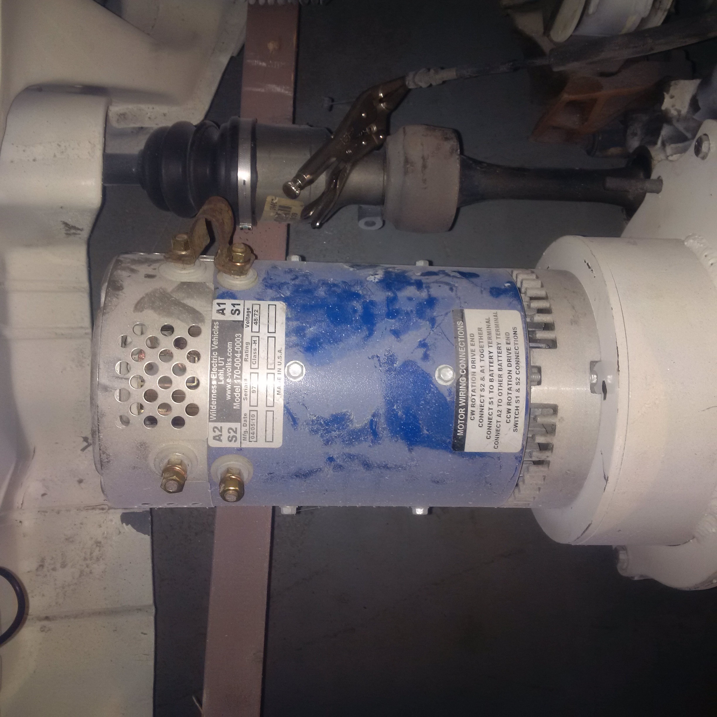 Some new progress as of Feb 3, 2016 is that the motor has now been powered up for the first time while attached to the transmission. Here are some pictures of the motor, contactor, controller, throttle box and shunt, and the tungsten disulfide sprayed into the brushes. I found by experimenting with an electric lawnmower that it freed up so much energy by spraying the brushes with ws2 that it actually burnt the strip fuse for the safety brake because it was more than the fuse could handle (30A strip fuse).
