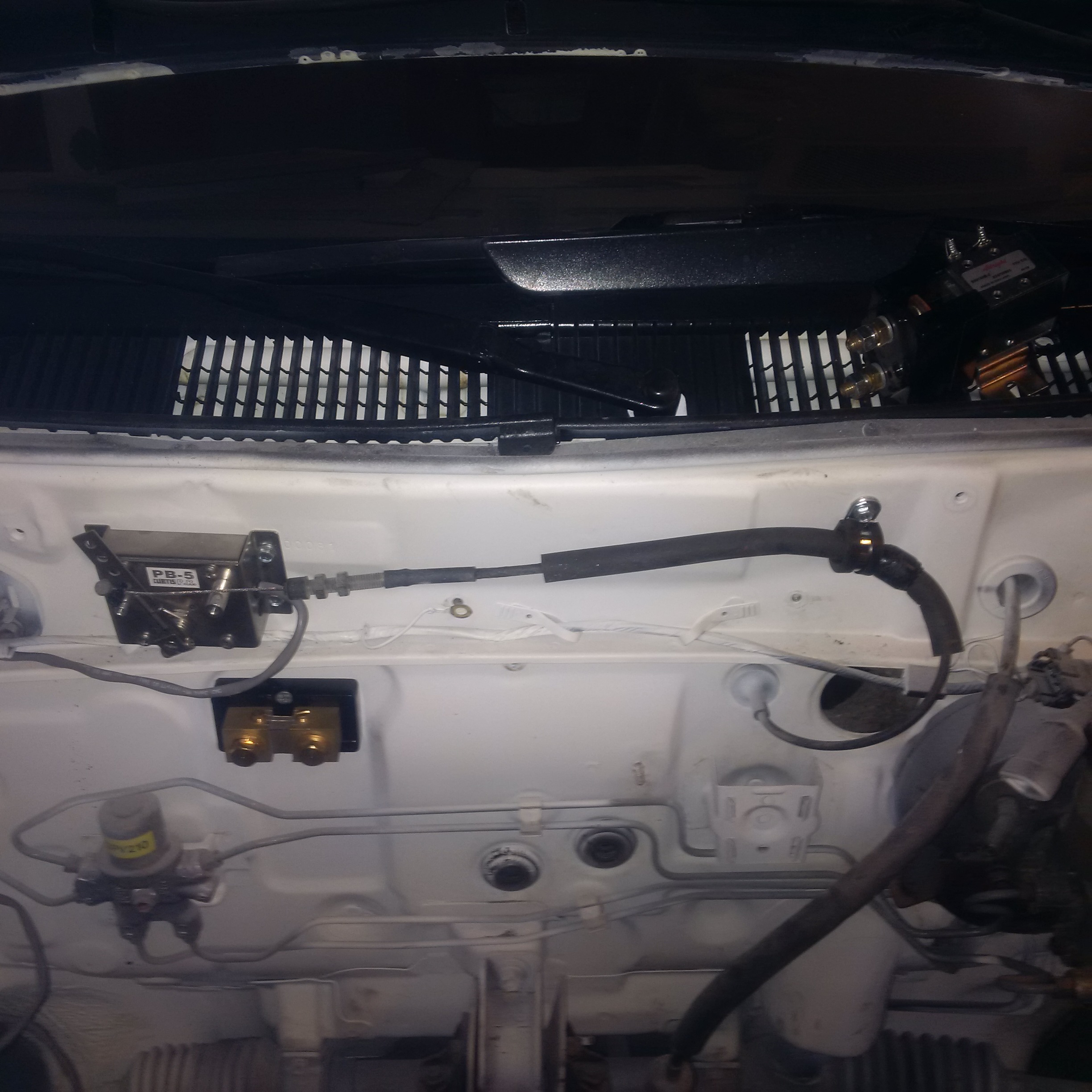 Did a bunch of work this week. That first long trip managed to rip the two brackets off for the front sway/stabilizer bar so I managed to save the one and then make a new one out of a piece of bed frame bending it around a 22mm socket in the vice and some persuasion from a hammer. Also mounted the main 12v switch now to turn on the dc dc converter. Then created a front grille block and left a bit open on the one side for cooling of the dc dc converter, controller, and motor brushes. Not much heat after 10 km run. Also replaced the gear oil in the transmission with 2L of Mobil Dexron VI which has a crazy low viscosity index and added 4 oz of NMF and 2 heaping teaspoons of tungsten disulfide. Car coasts noticably better and accelerates easier now too. Front end picture taken April 10, 2016.
