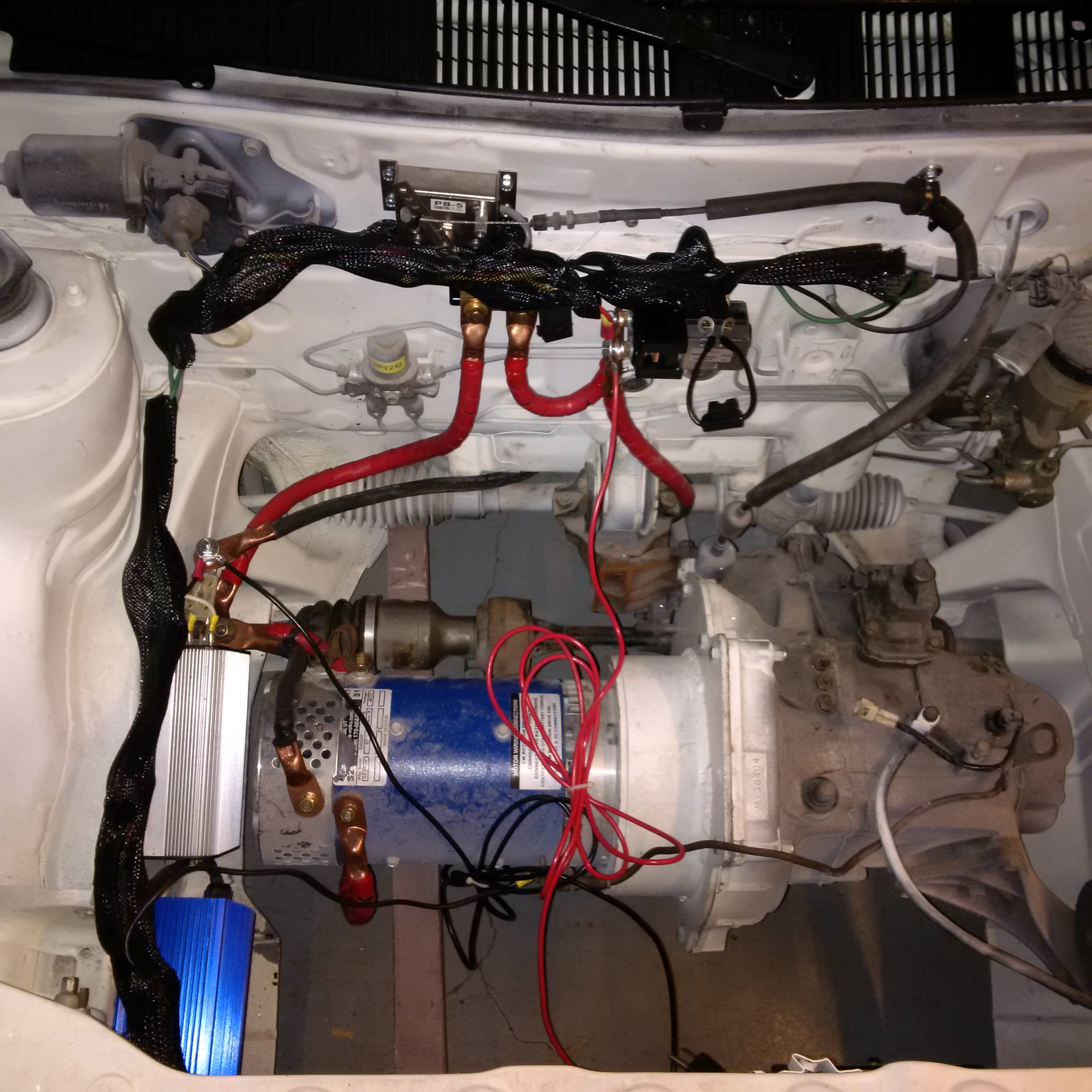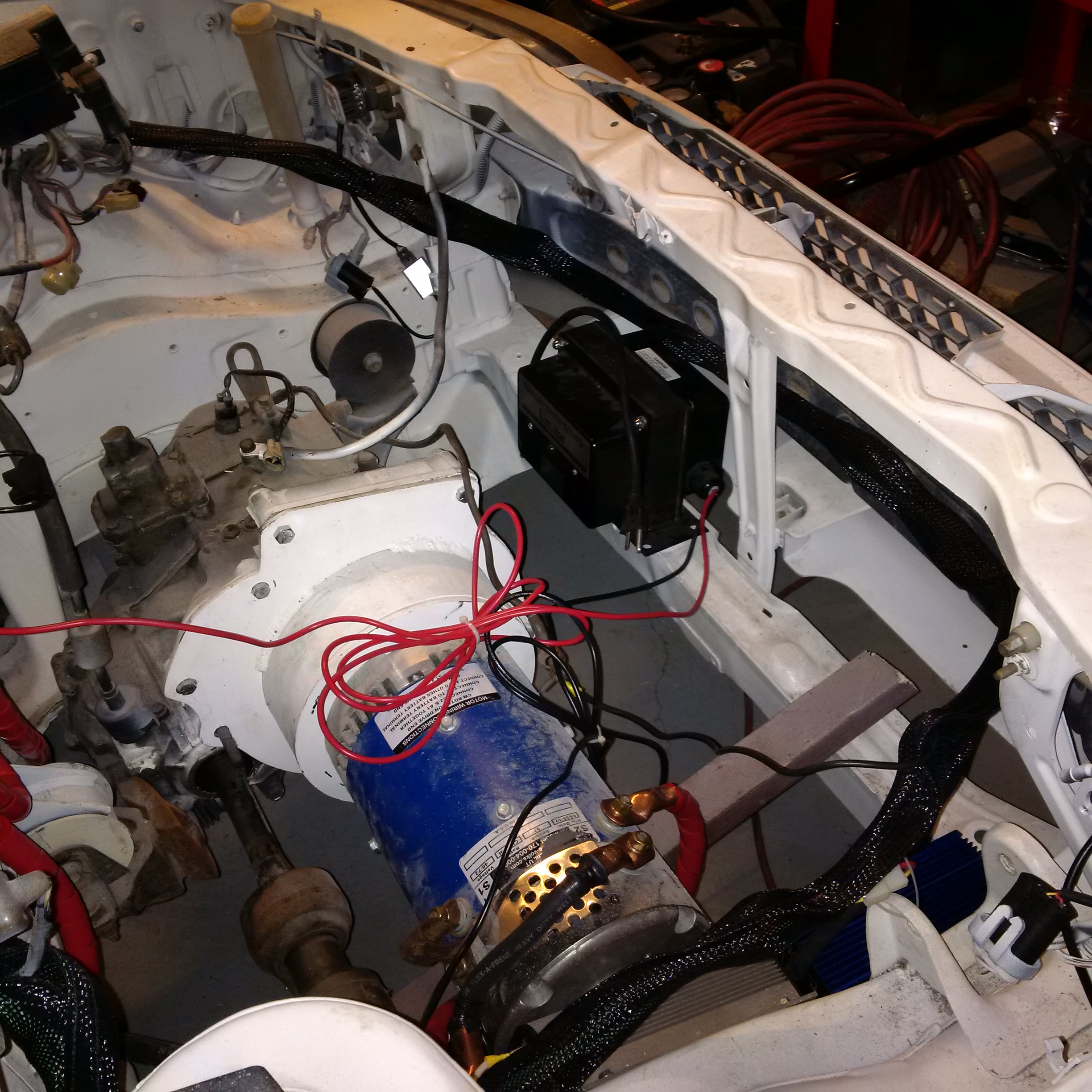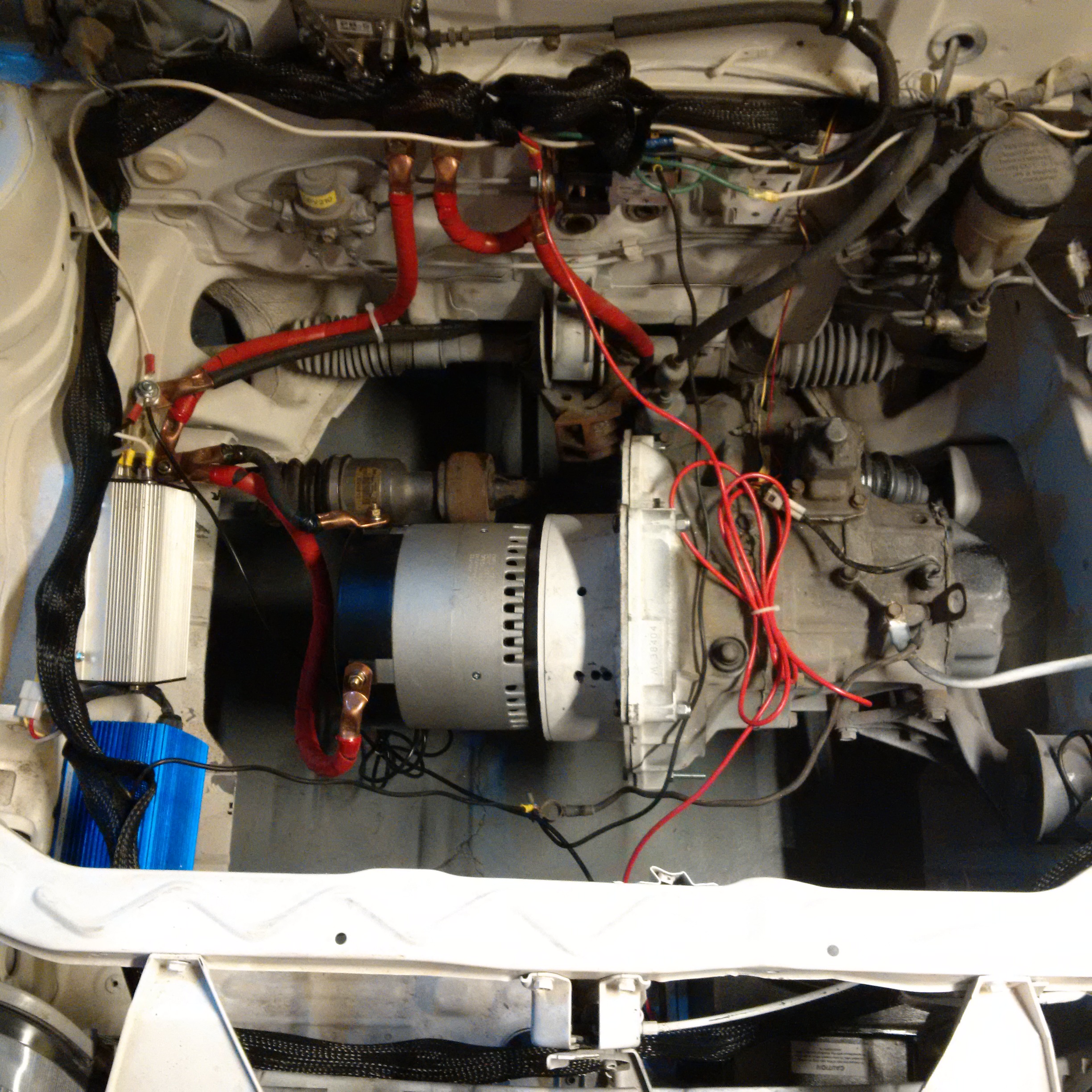 Some major progress Feb 21, 2016. Powered up the engine through the controller, contactor, and shunt. Tested out the throttle box and it worked great. Did some forward and backward in the garage a few feet and it was very jumpy. I have the the RX7 wheels back on it after getting painted and they're installed with alloy lug nuts. Then there is the picture of the new cabling in the engine bay. Brakes and emergency brakes were both closely inspected and checked out.