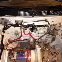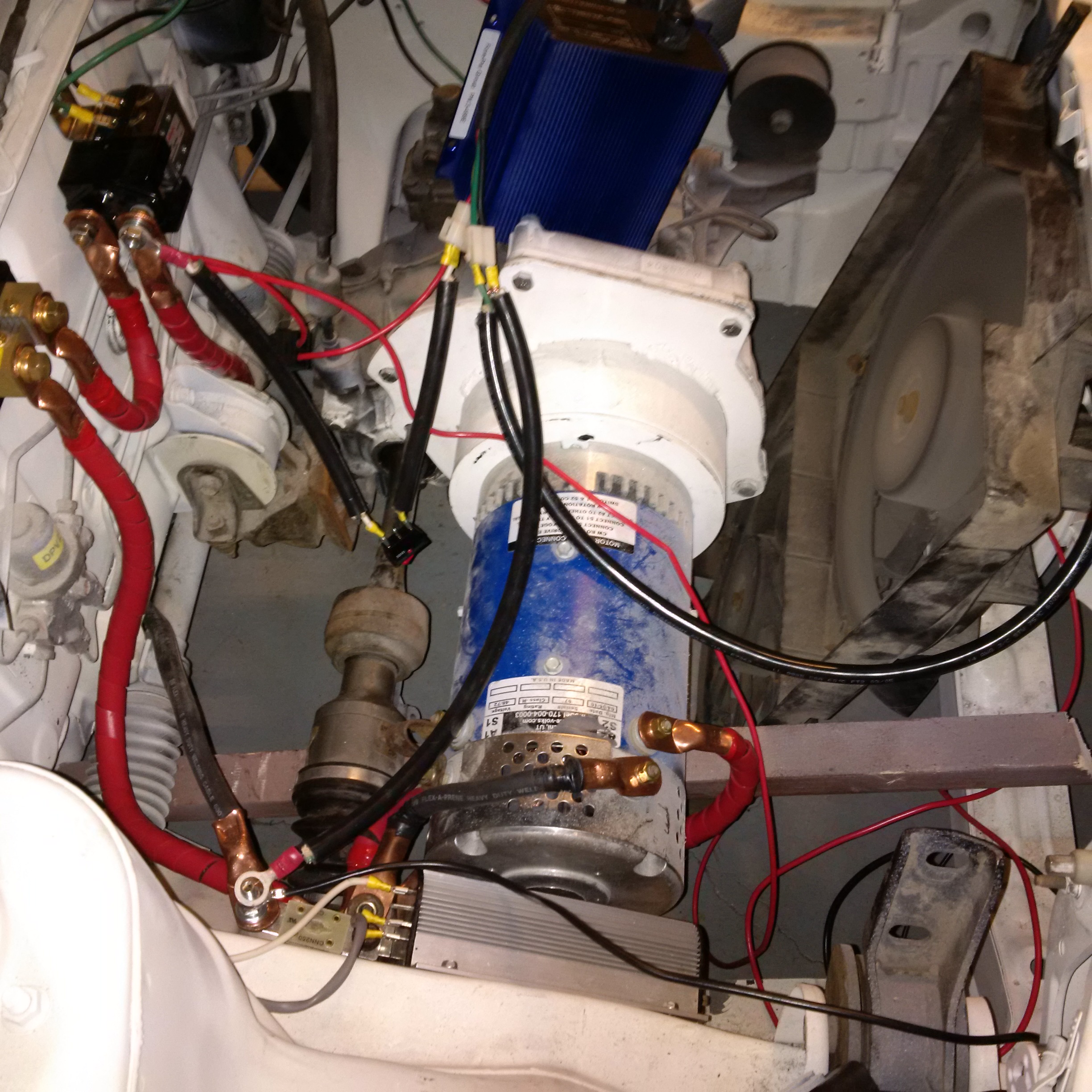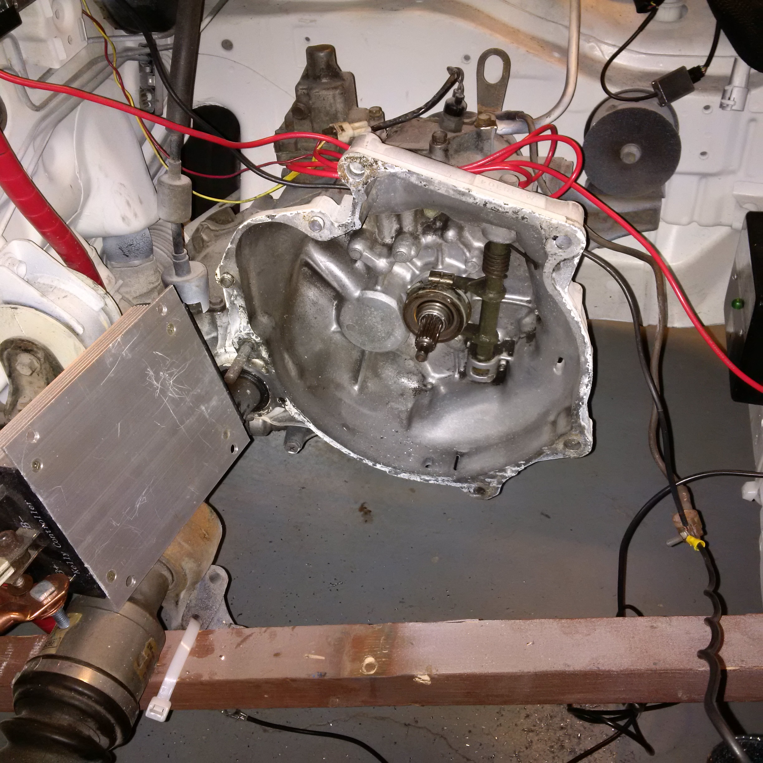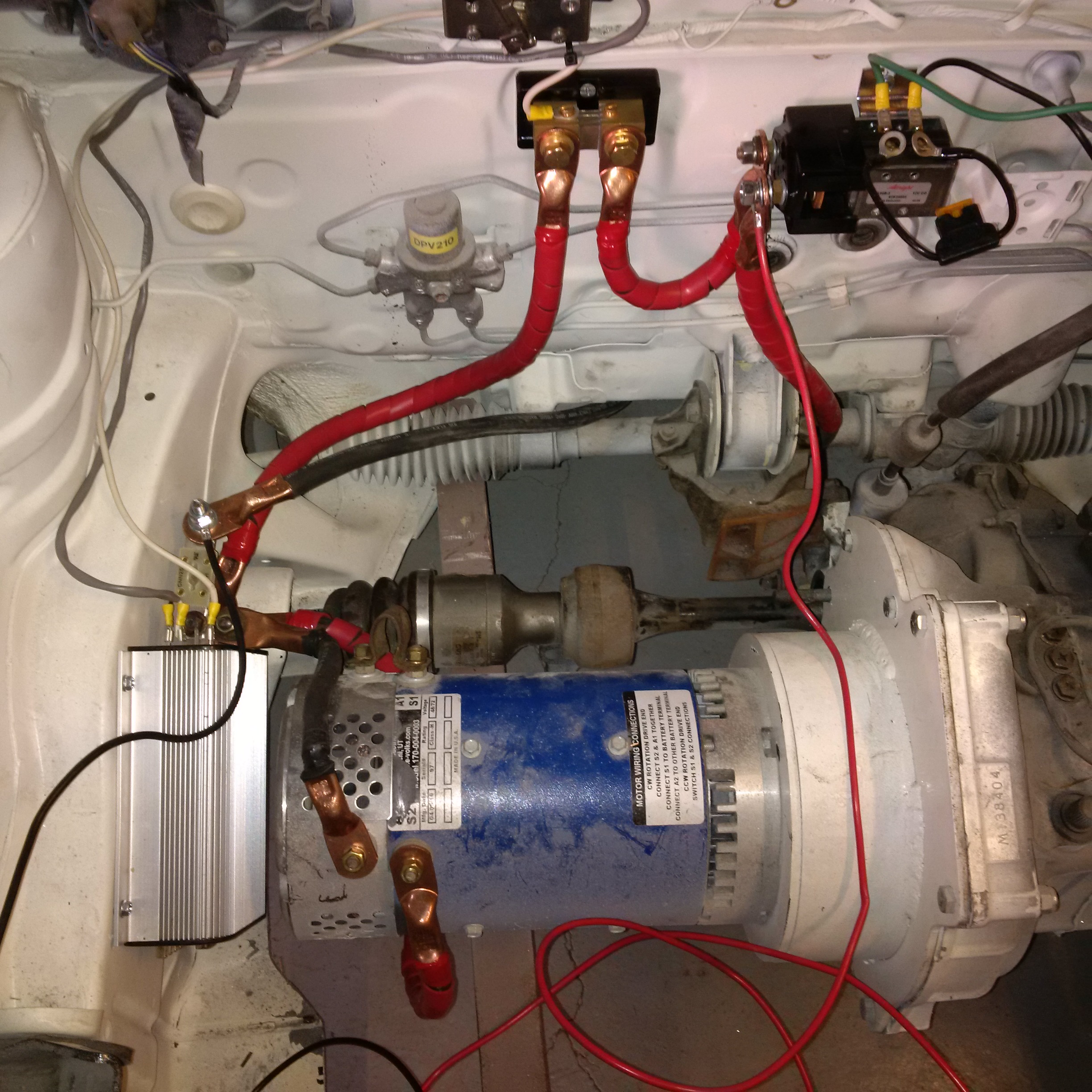 Some major progress Feb 21, 2016. Powered up the engine through the controller, contactor, and shunt. Tested out the throttle box and it worked great. Did some forward and backward in the garage a few feet and it was very jumpy. I have the the RX7 wheels back on it after getting painted and they're installed with alloy lug nuts. Then there is the picture of the new cabling in the engine bay. Brakes and emergency brakes were both closely inspected and checked out.