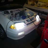 Got a bit more done March 7, 2016. Hooked up the dc dc converter to the 12v main fuse box. Here are some of the pictures with the lighting working. One of the headlights has a bad high beam so I'll have to get that dealt with. Some of the sockets were corroded so they're going to need some tlc with a small wire brush to get them cleaned up. Horn is broken so I have to replace that. Everything else seems to work more or less including the heater blower motor and the rear defrost. I have to test the rest of the electrical out and omit whatever I don't need. Working on converting all the exterior lighting to LED bulbs. Need to figure where I'm going to permanently mount the dc dc converter and tidy up the wiring. I don't see any trouble running just off the dc dc converter without a battery other than the clock keeps resetting to 1:00 but that could be a good way to help me track my runtime.